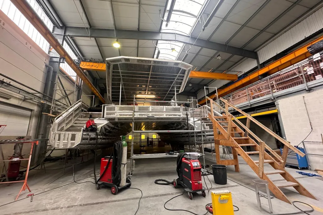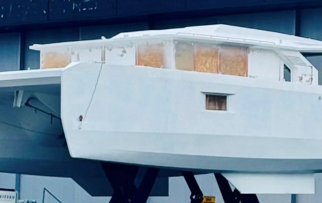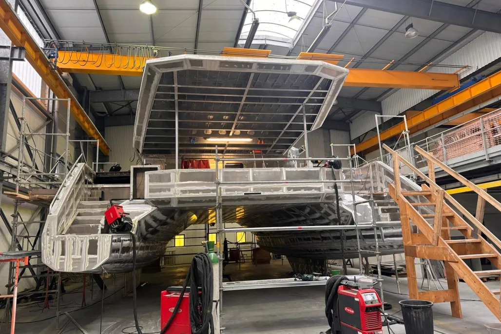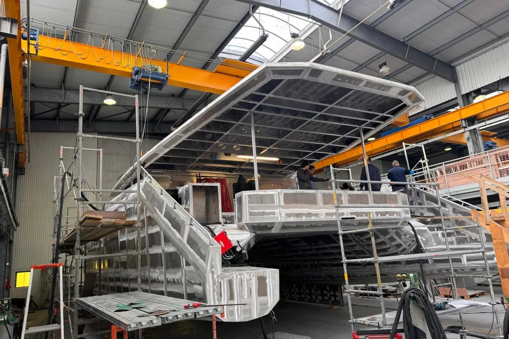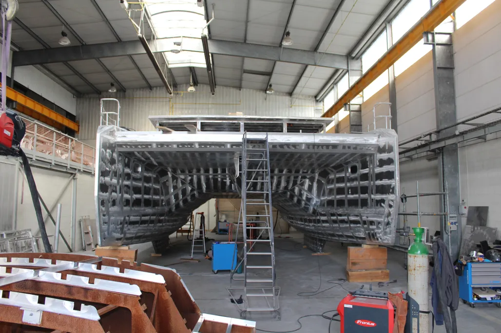 Catamaran proposé en coque nue, destiné à un acquéreur souhaitant concevoir un bateau réellement sur mesure.